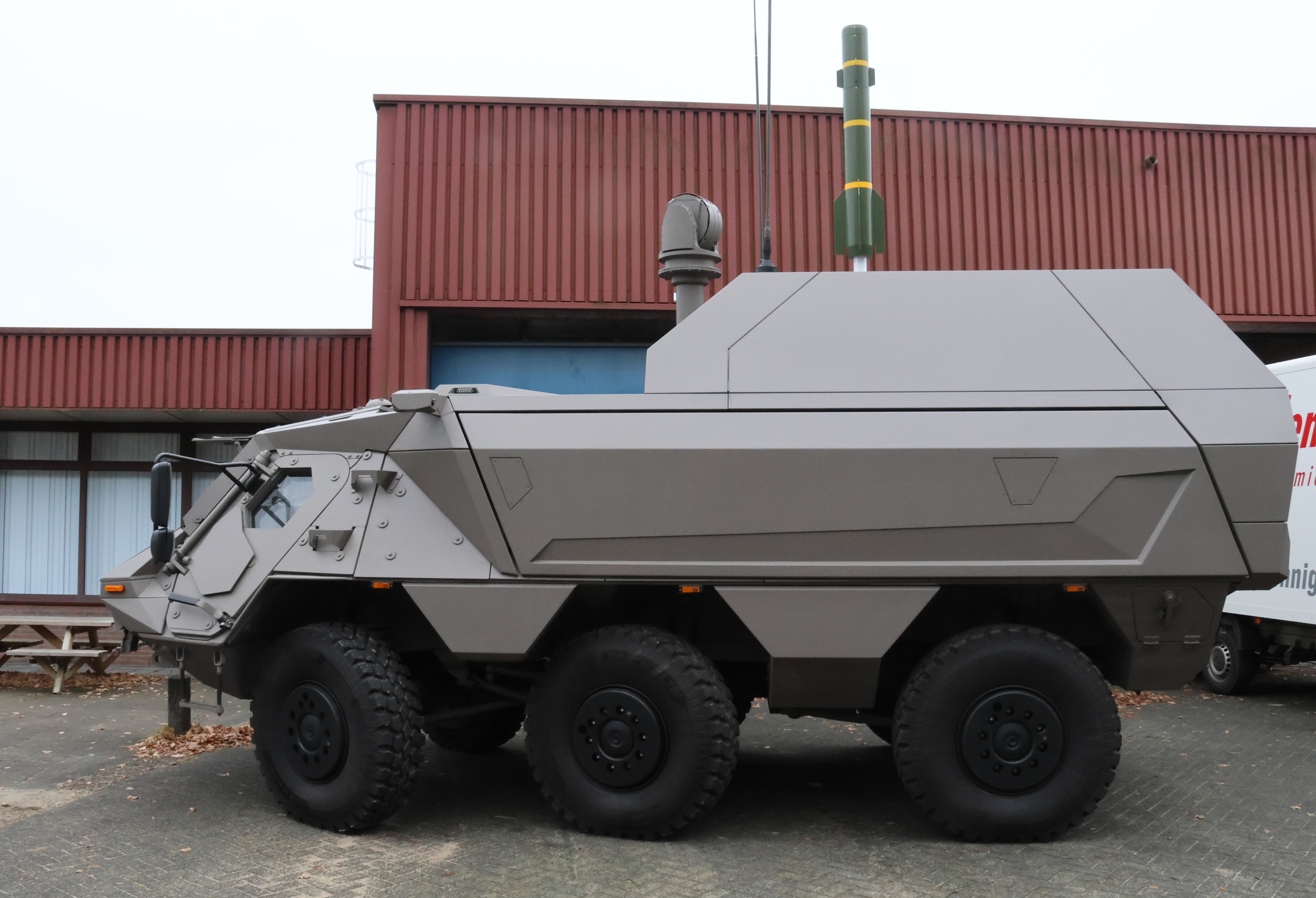 Buiten stond een display van nieuwe voertuigen opgesteld, waaronder het Kinetic Defence Vehicle van de firma Diehl.